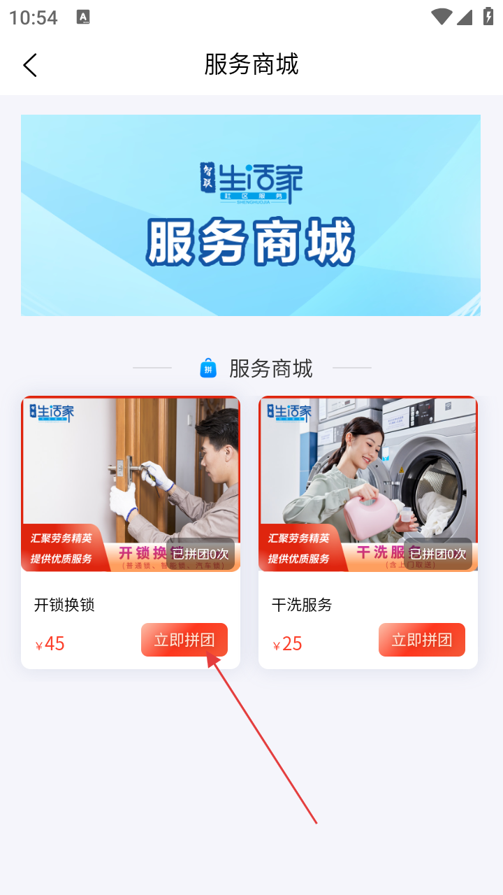 2、进入服务商城页面后,找到【开锁换锁】服务,点击其下方的【立即拼团】按钮。