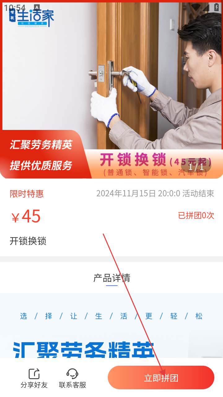3、进入“开锁换锁”服务详情页,再次点击【立即拼团】按钮。