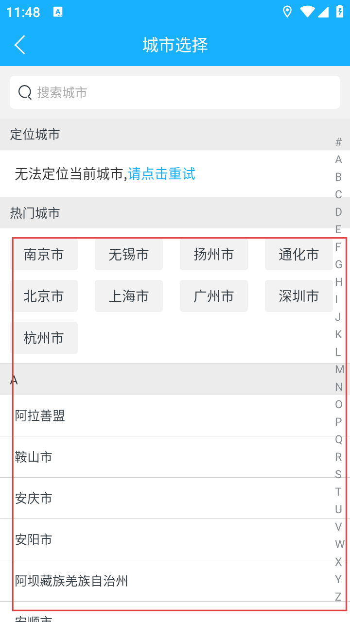 1、进入【城市选择】页,可搜索或从热门城市选定位城市。