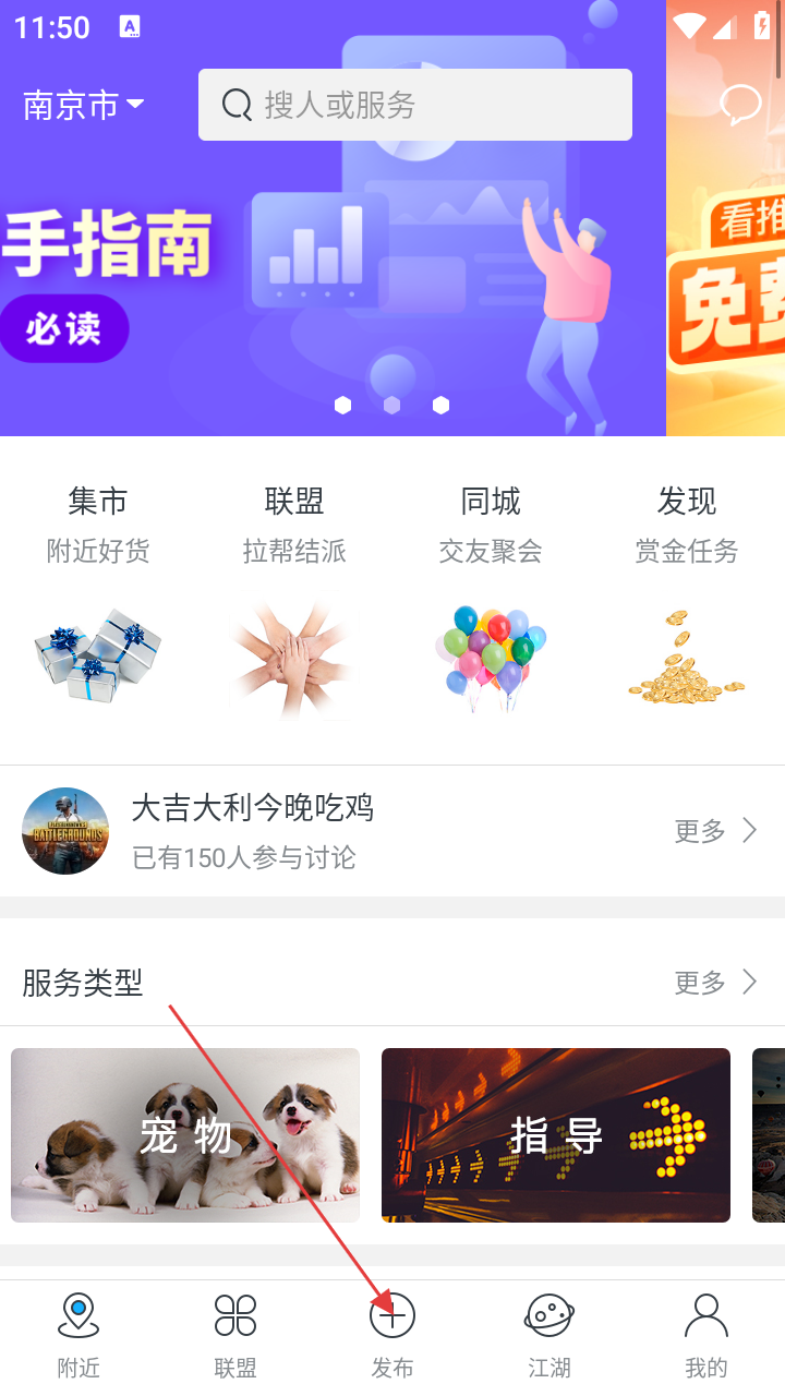 2、选好城市后,在首页点底部【发布】,进入发布功能选择页。