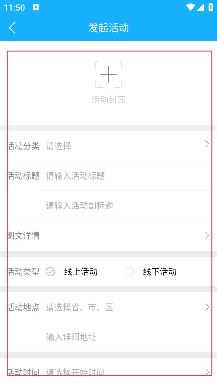 4、在【发起活动】页,依次填封面、分类、标题等信息,选活动类型、填地点和时间,完成活动发布。
