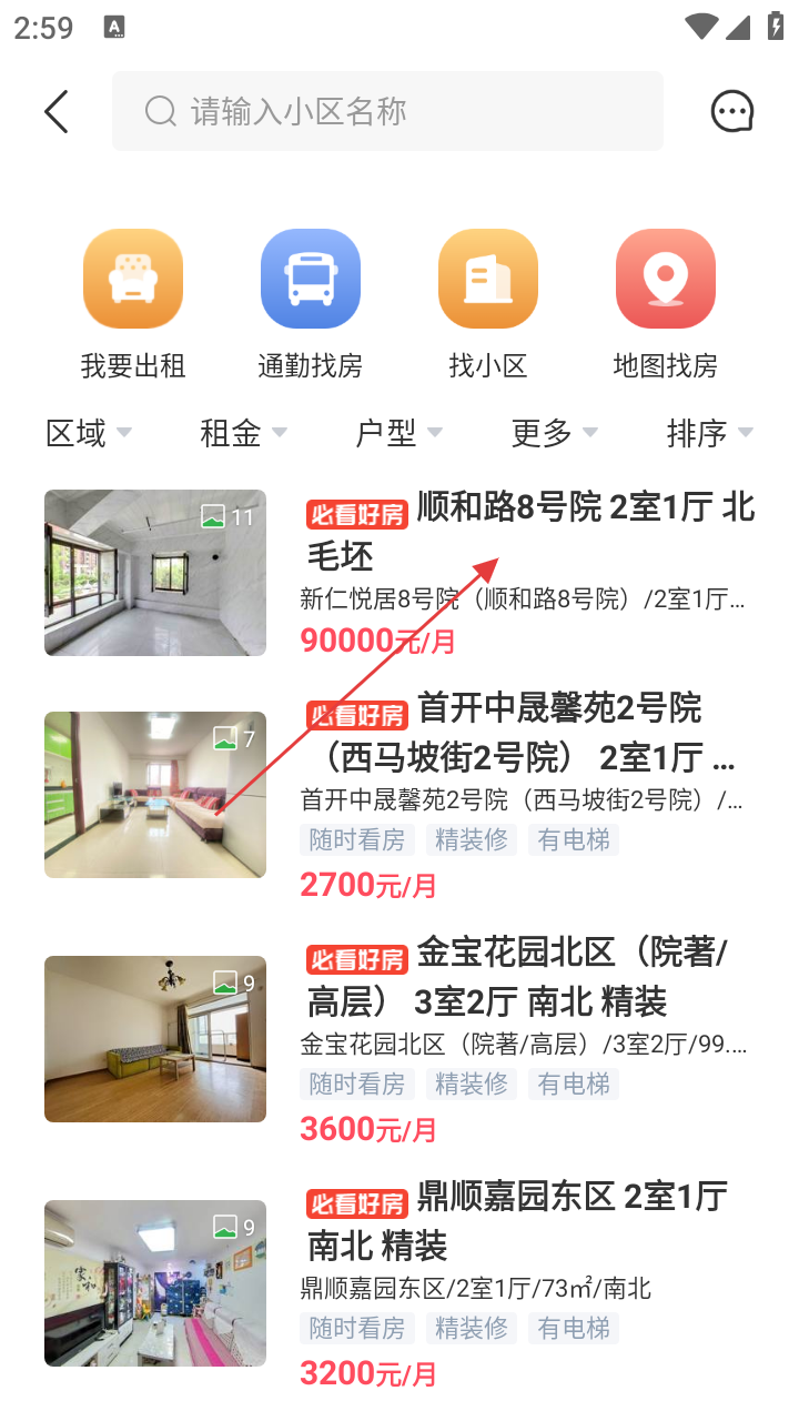 2、进入出租房源列表页面,选择心仪的房源(如顺和路8号院2室1厅)。