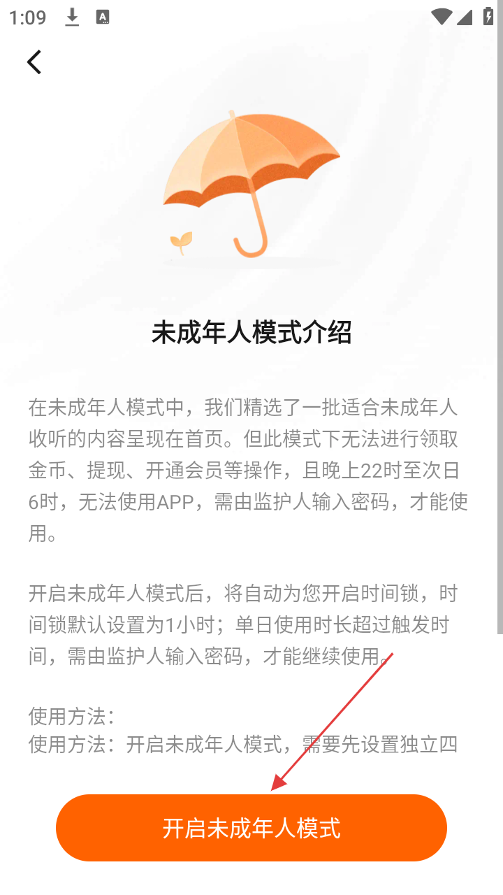 4、在未成年人模式介绍页面,可了解该模式相关规则,点击【开启未成年人模式】按钮,即可开启该模式。