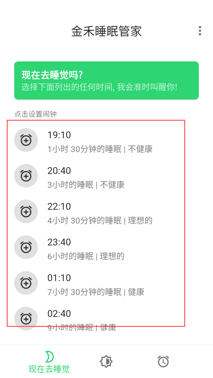 2、进入首页,在“现在去睡觉吗?”下方,选想设置的睡眠闹钟时间,点对应闹钟前【+】。