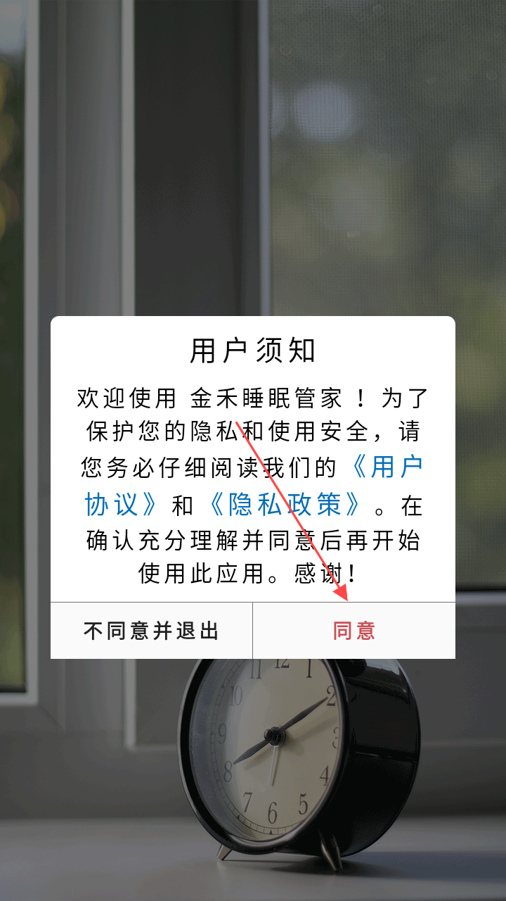 1、首次打开金禾睡眠管家,弹出【用户须知】,点【同意】。