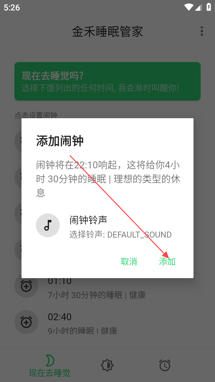 3、弹出【添加闹钟】确认框,显示闹钟响起时间、睡眠时长等,点【添加】。