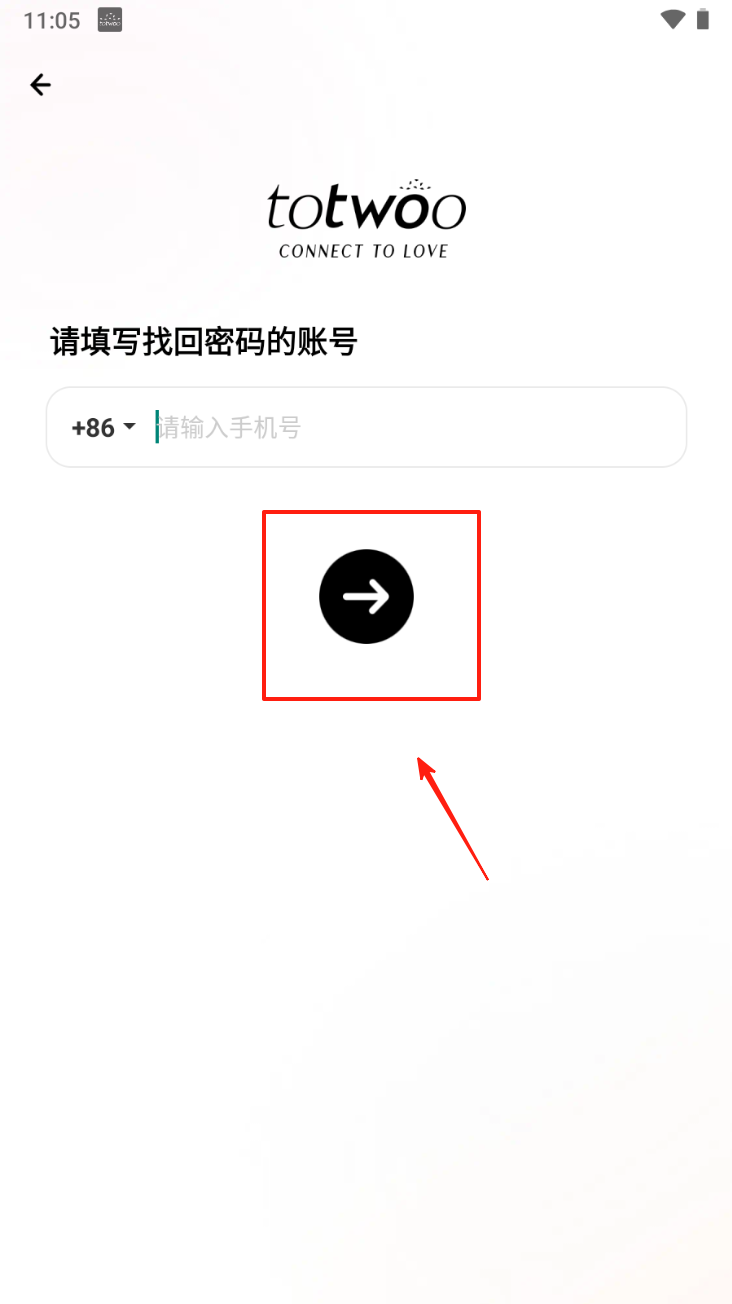 3、在找回密码页面输入手机号,点击箭头图标获取验证码。