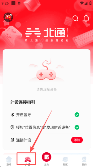 2、按指引开启蓝牙授权位置,连接北通鲲鹏20外设成功启动。
