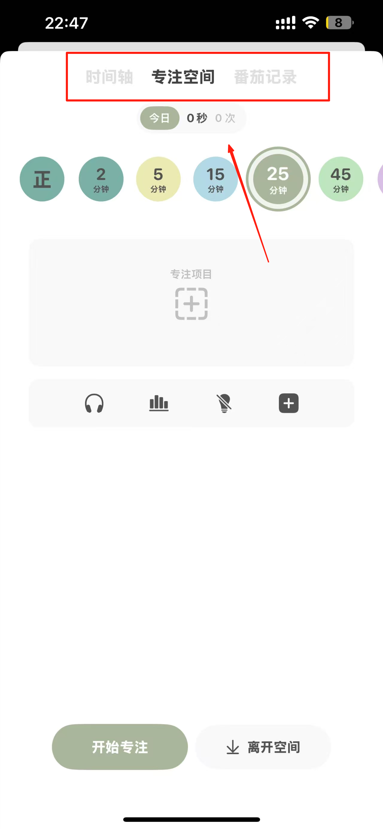 3、点击底部导航栏的“专注空间”进入专注计时功能。