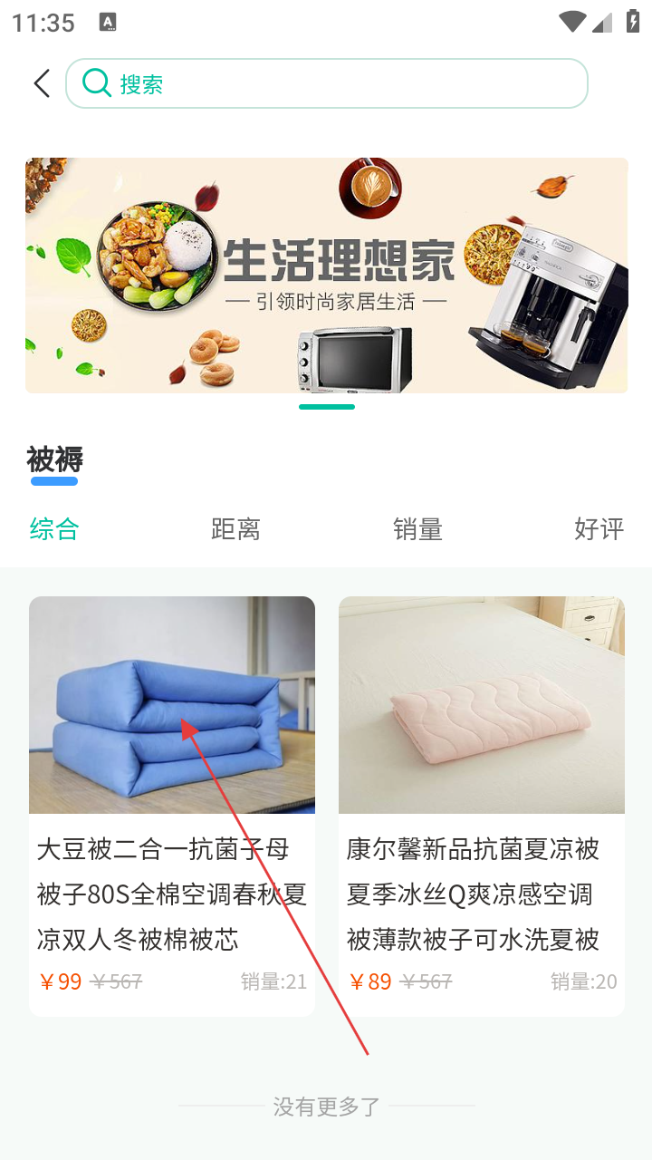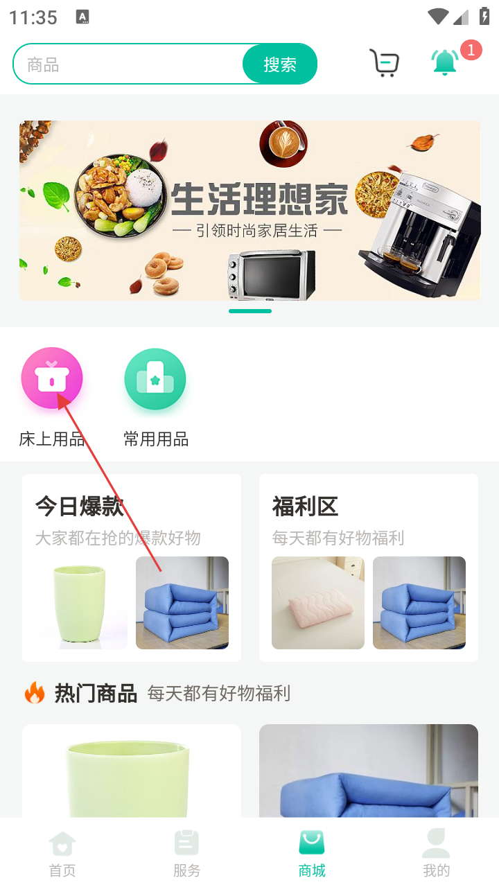2、在商城,点击【床上用品】分类,进入被褥商品列表。