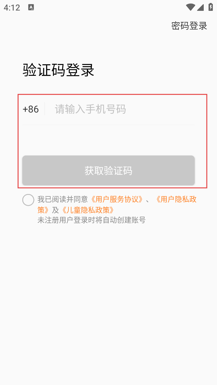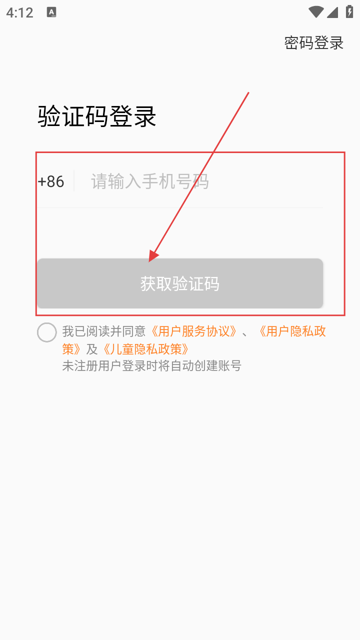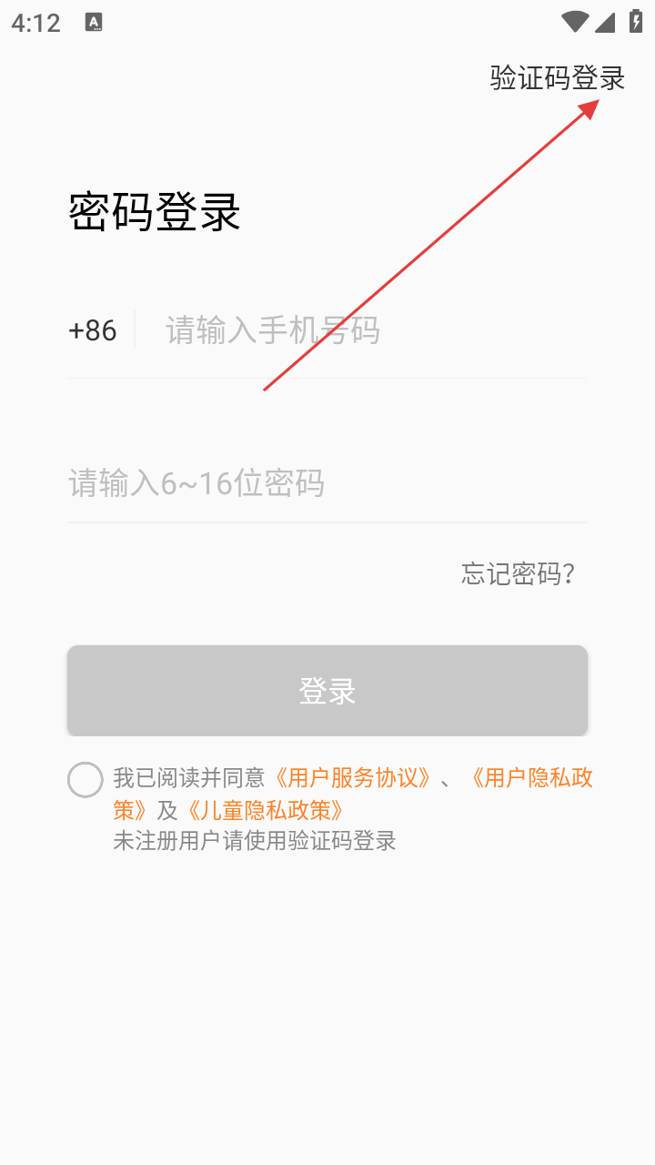 2、在【密码登录】页,点击右上角【验证码登录】,切换登录方式。
