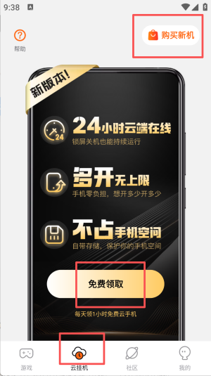 2、进入 “云挂机” 页面,点击 “免费领取” 获取云手机相关权益并开始使用。