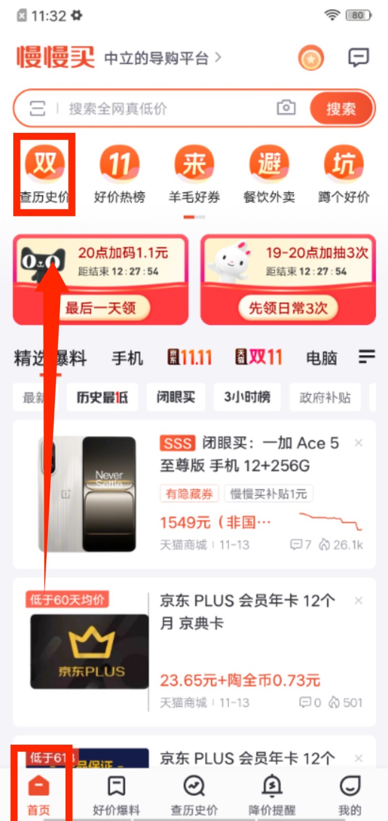 1、打开慢慢买 APP,在首页点击 “查历史价” 功能入口,进入对应页面。
