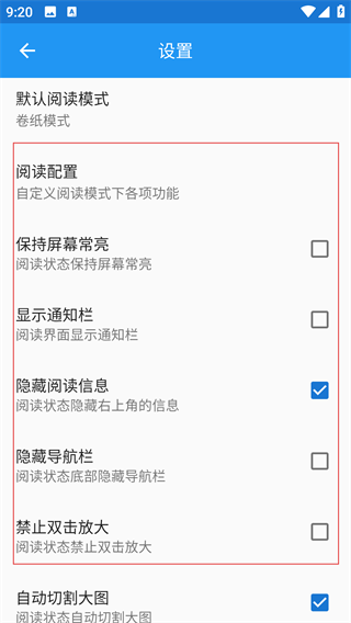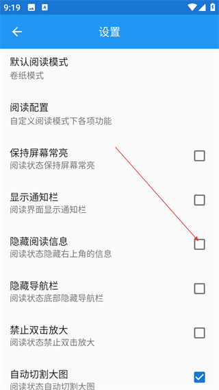 3、在设置页面,可调整阅读设置,如点击【隐藏阅读信息】选项,开启后阅读状态将隐藏右上角的信息。