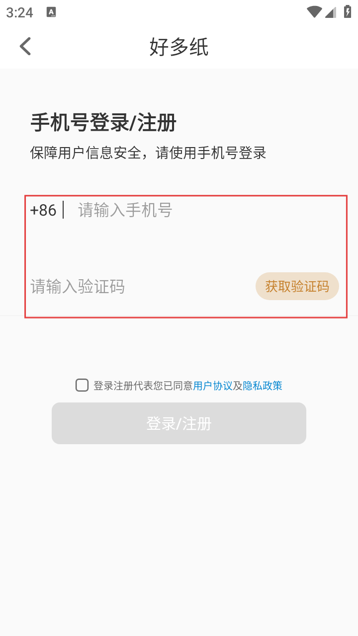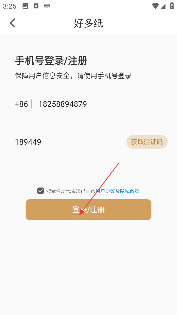 4、输入好手机号、验证码并勾选协议后,点击【登录/注册】按钮,完成登录注册操作。