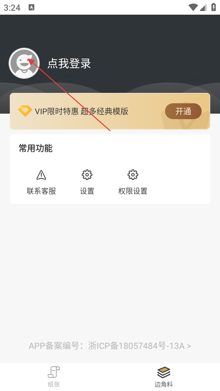 2、进入边角料功能页面,若要登录账号,点击左上角的头像区域,进入登录界面。