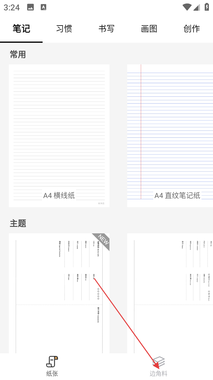 1、在“笔记”分类页面,若要使用边角料相关功能,点击右下角的【边角料】选项。