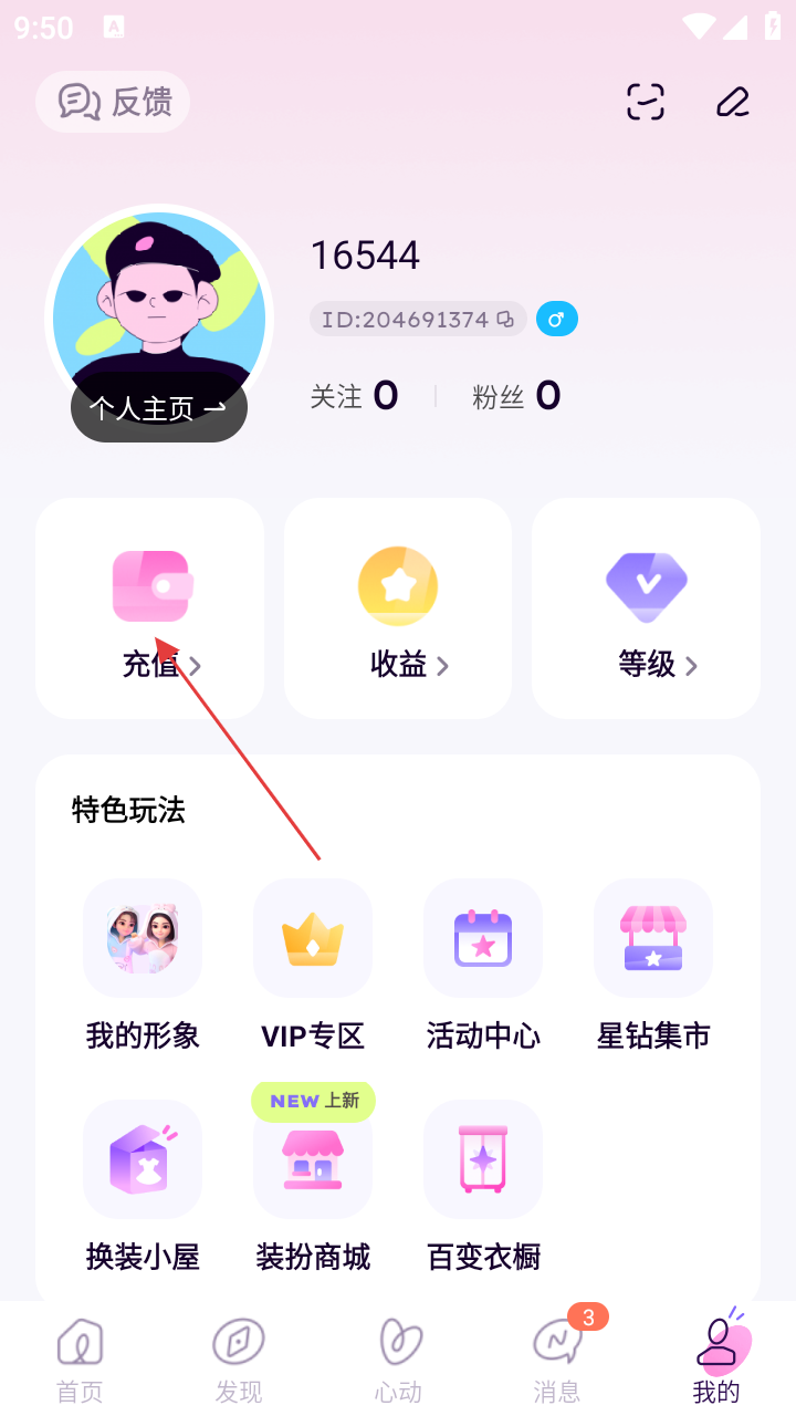 3、在“我的”页面,点击【充值】按钮。