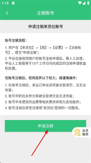 4、在注销账号页面阅读相关规则后,点击申请注销按钮,提交来货拉账号的注销。
