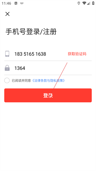 3、在“手机号登录/注册”页面,依次填写手机号、获取并输入验证码。