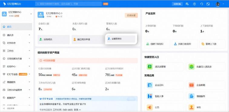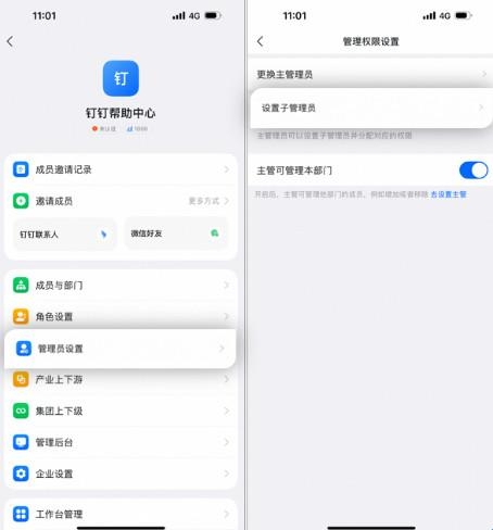 1、【手机端钉钉】-【通讯录】-左上角【切换对应企业】-【管理】-【管理员设置】-【设置子管理员】- 【添加】/点击对应的管理组【编辑】添加/修改/删除子管理员即可。