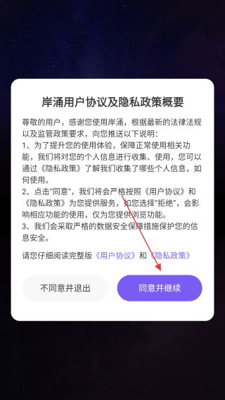 1、打开应用查看协议点击同意并继续。