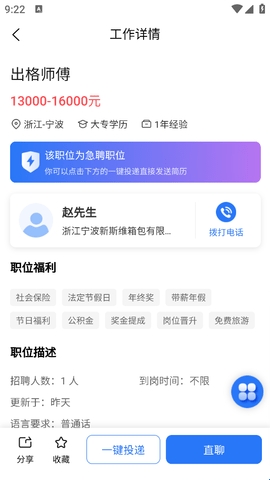3、找到之后直接点击进入,可以“一键投递”你的个人简历,或者直接和HR聊天,去预约面试或到岗的时间。