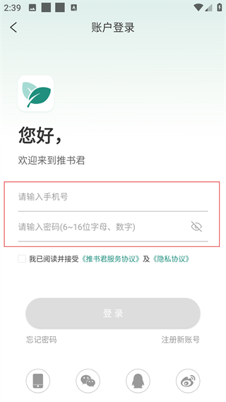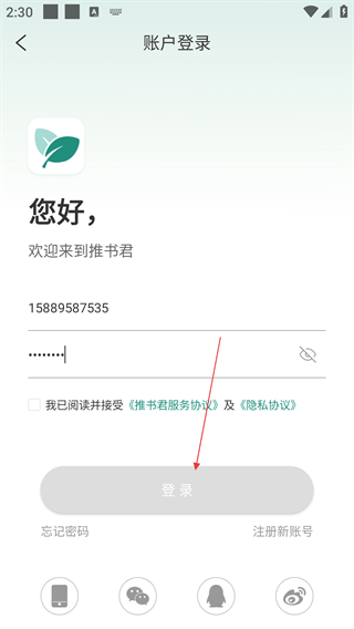 4、勾选已阅读并接受《推书君服务协议》及《隐私协议》后,点击【登录】,即可完成账号登录操作。