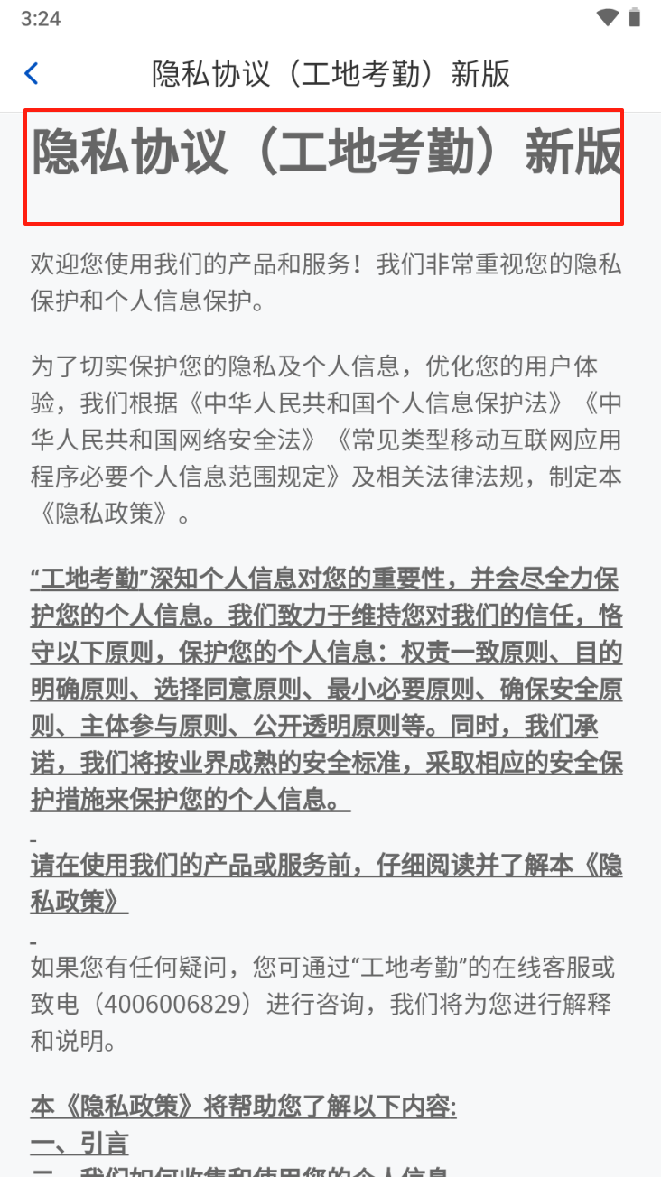 2、了解隐私协议内容。仔细阅读《隐私协议(工地考勤)新版》。