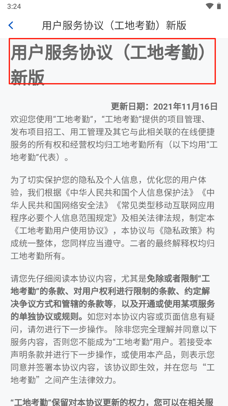 3、阅读用户服务协议。查看《用户服务协议(工地考勤)新版》并同意条款。