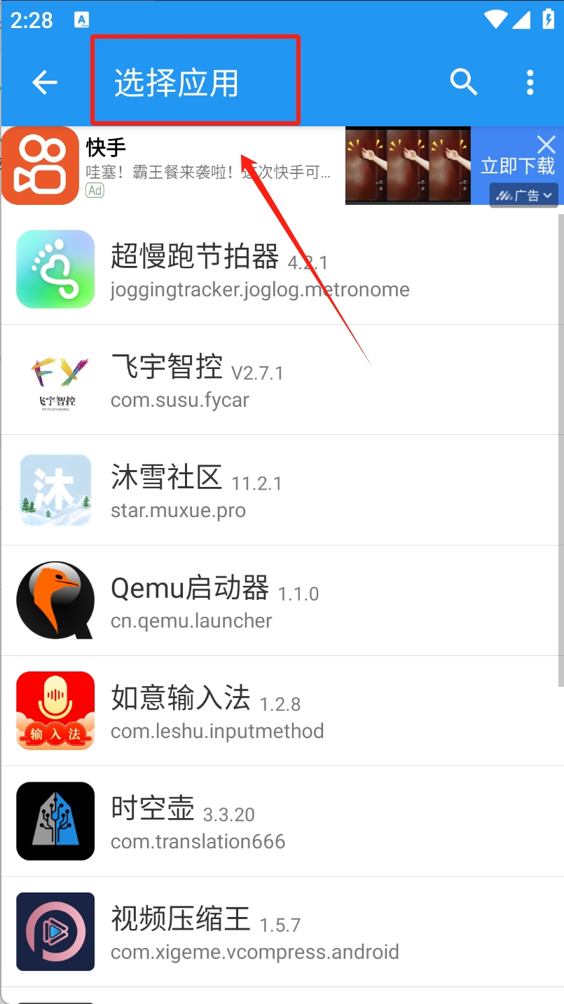 2、在“选择应用”页面,选择你想要添加分身的应用,如快手等。