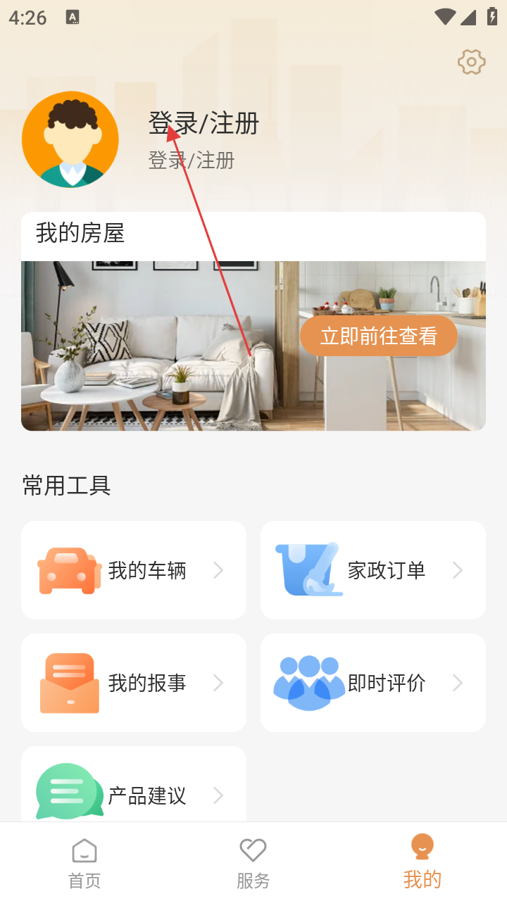 2、在【我的】页,点击【登录/注册】,进入登录流程。