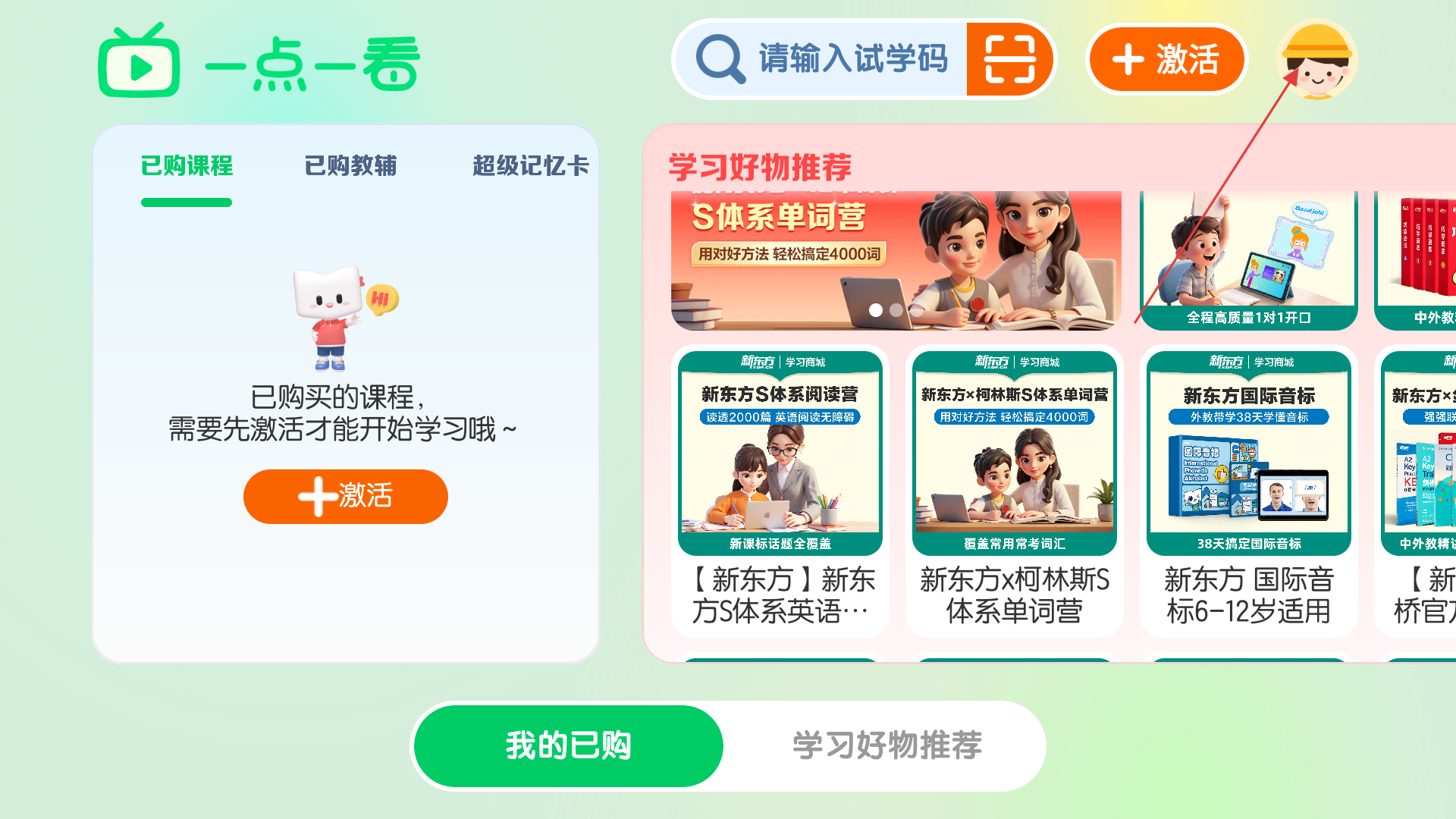 2、进入应用后,在【我的已购】页面可查看已购课程,点击【激活】解锁学习权限,同时能浏览【学习好物推荐】的内容。