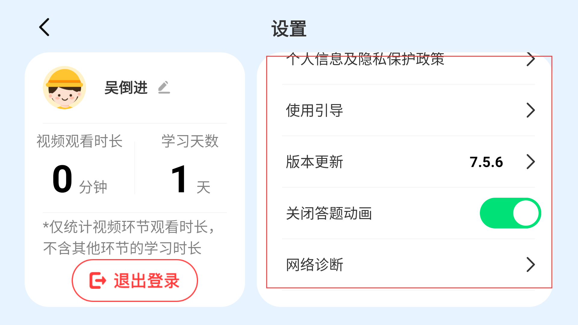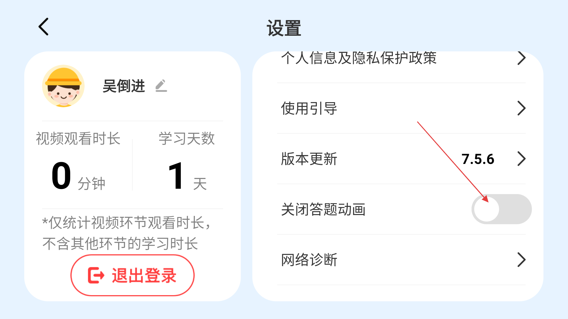 4、在【设置】中开启【关闭答题动画】开关,可关闭答题过程中的动画效果,优化学习操作的流畅性。