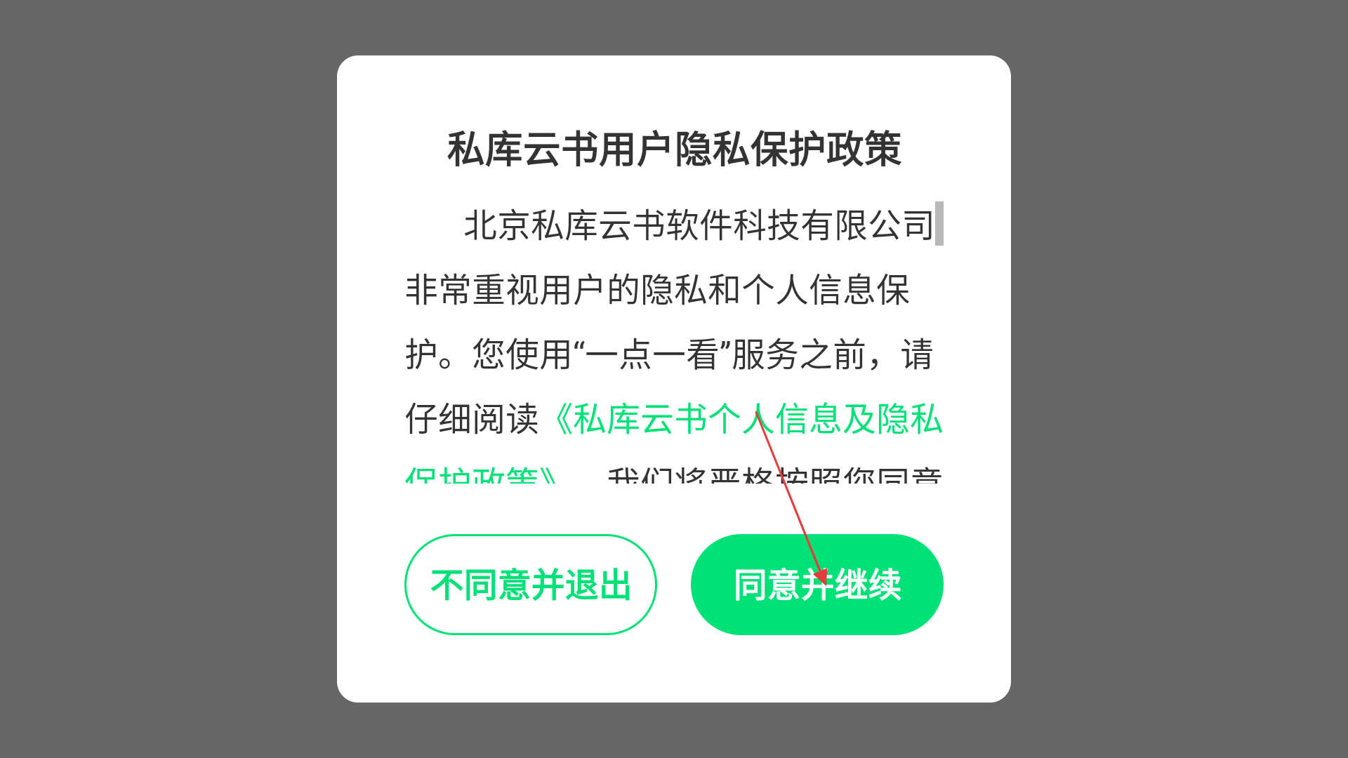 1、首次进入需阅读【私库云书用户隐私保护政策】,点击【同意并继续】按钮,方可进入【一点一看】应用使用服务。