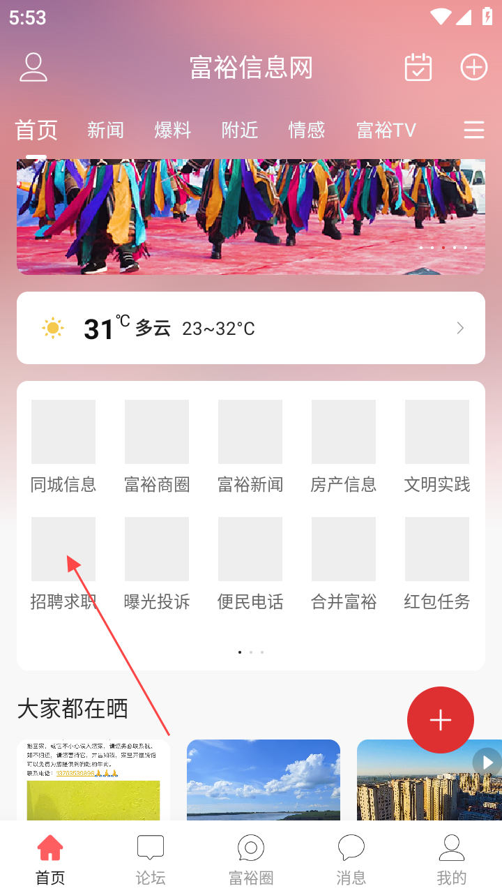 1、打开富裕信息网,在首页点【招聘求职】,进招聘列表页。