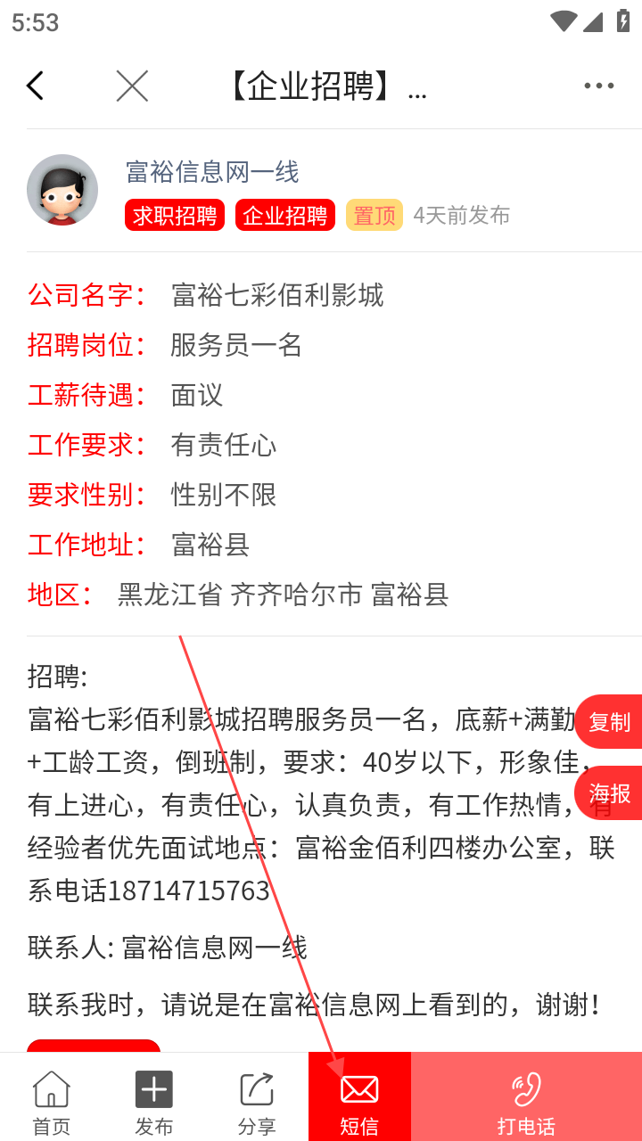 3、在详情页,点【短信】按钮,跳转短信界面。