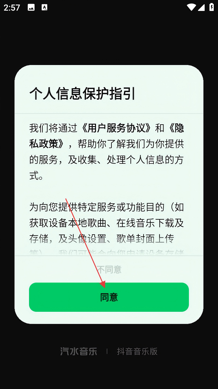 1、打开汽水音乐APP,弹出个人信息保护指引,点击【同意】,进入后续操作。