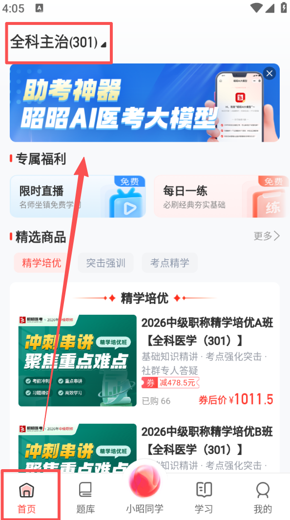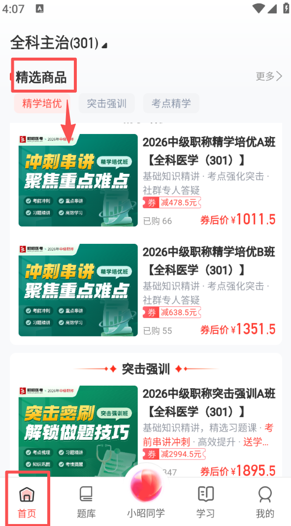 3、回到首页的精选商品区域,挑选适合的全科医学课程班次。