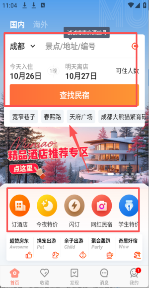 1、在首页选择目的地“成都”,点击“查找民宿”进行搜索。