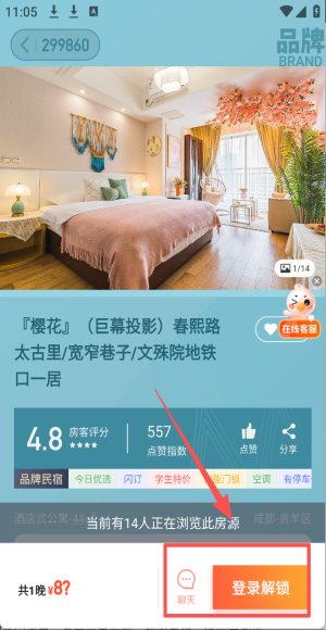 4、查看房源详情,点击“登录解锁”查看完整价格并预订。