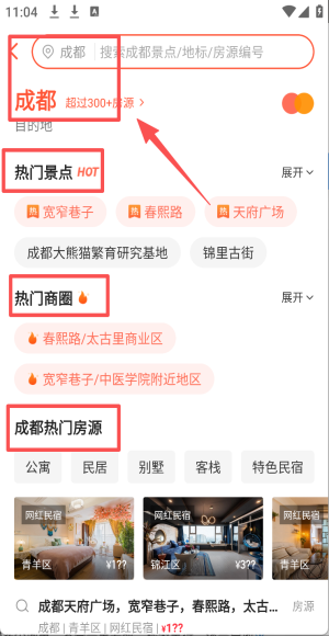 2、浏览“热门景点”和“热门商圈”,选择感兴趣的房源。