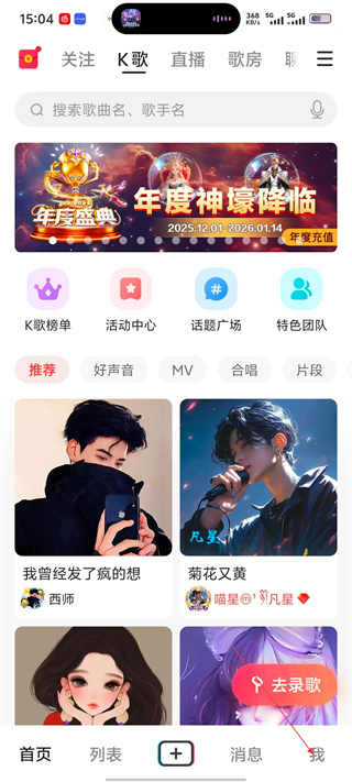1、在【K歌】页面浏览推荐作品,点击底部【我】进入个人中心,查看账号相关功能入口。