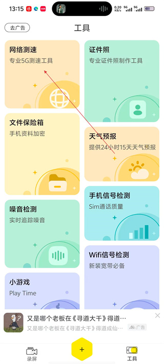 1、在【录屏高手】主界面点击底部【工具】按钮,进入工具功能页,可使用【网络测速】【证件照制作】等附加工具。