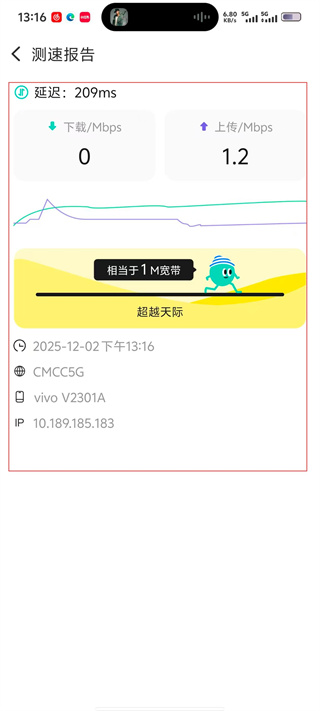 4、测速完成后生成报告,展示【209ms】-延迟、【1.2Mbps】-上传速度、【CMCC5G】-网络类型等核心信息。