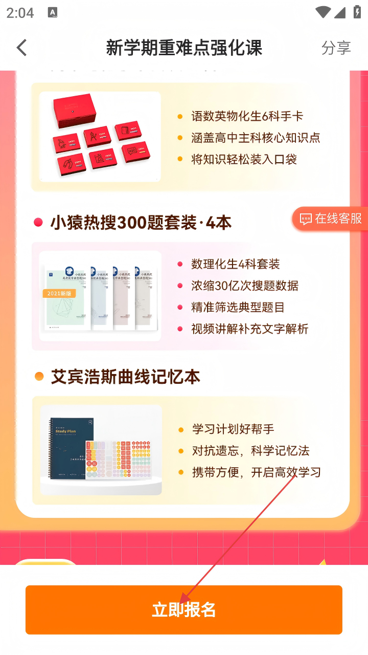 3、进入“新学期重难点强化课”页面,点击【立即报名】。