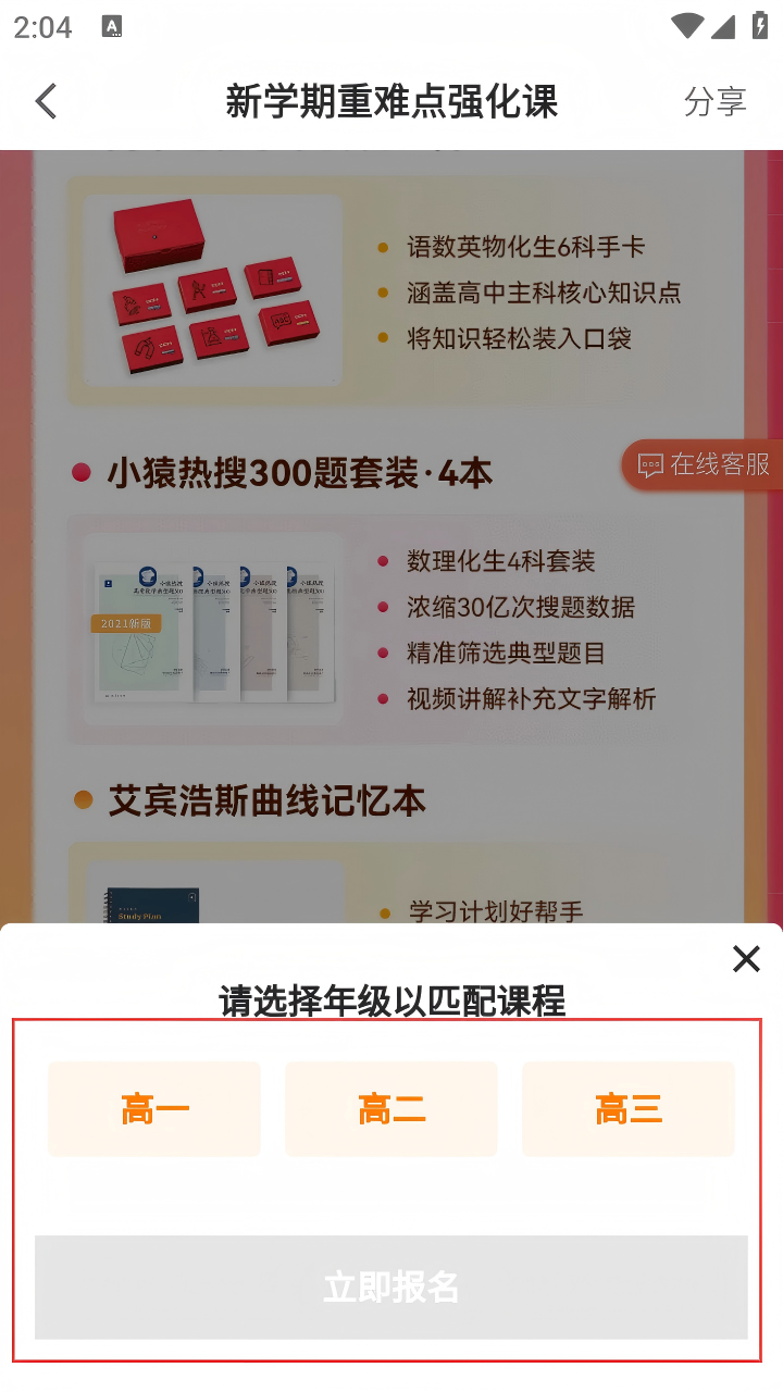 4、在弹出的选择年级页面,选择对应的年级,即可完成课程报名。