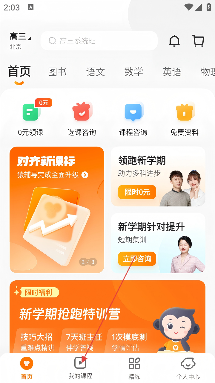 1、打开猿辅导APP,点击底部【我的课程】选项,进入“我的课程”页面。