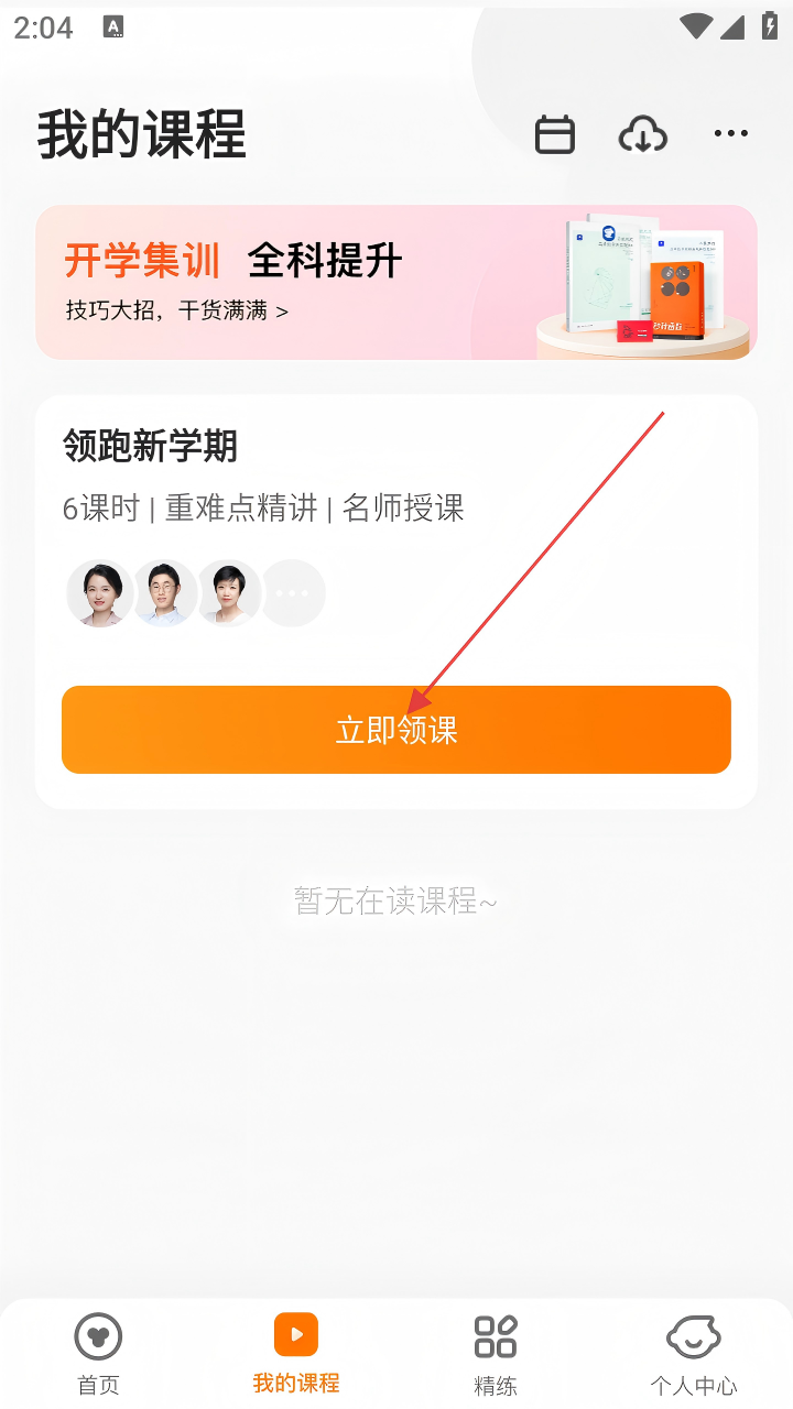 2、在“我的课程”页面,找到“领跑新学期”课程,点击【立即领课】。