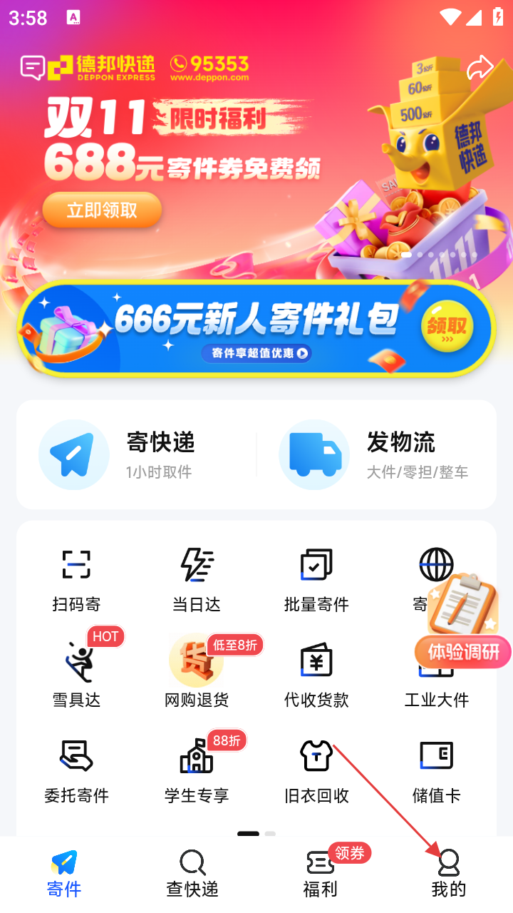 1、在德邦快递APP首页,点击右下角【我的】按钮,可进入个人中心,查看订单、地址簿等功能入口。